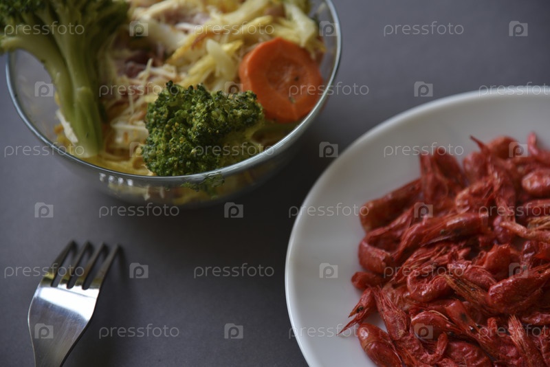 Белая тарелка с сушеными креветками и салатом в миске на сером фоне. Красные креветки и салат на завтрак