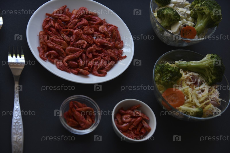 Красные сушеные креветки и салат в салатнице на черном фоне с вилками. Вкусный завтрак на черном фоне, салат и креветки