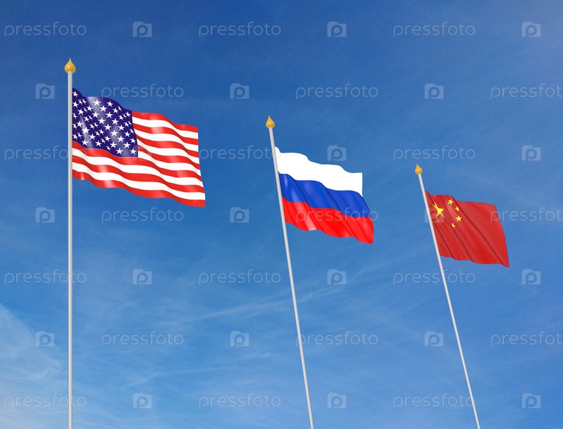 Развевающиеся три флага - России, США и Китая на фоне неба