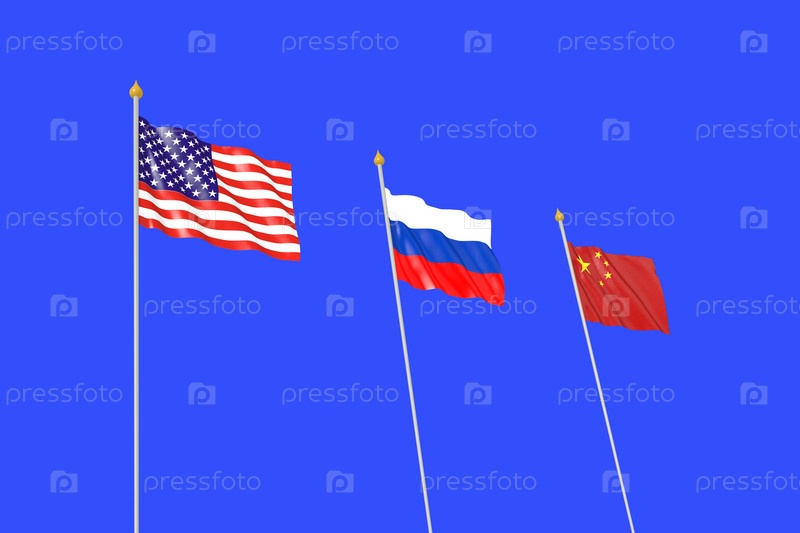 Три флага - Российской Федерации, Соединенных Штатов Америки и Китая на синем фоне