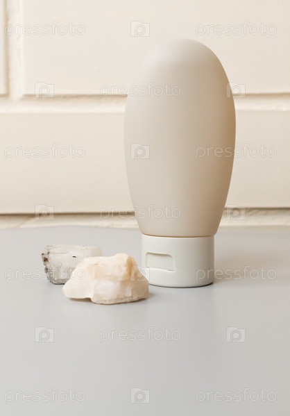 Многоразовая косметическая бутылка для путешествий и натуральные камни. Безотходный косметический продукт. Мокапы косметического брендинга