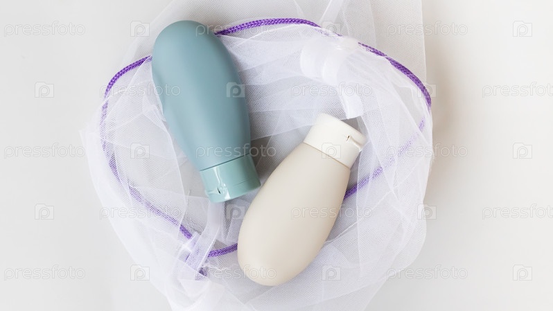 Набор дорожных многоразовых косметических флаконов в эко-сумке. Безотходный косметический продукт. Концепция туалетных принадлежностей для отпуска. Забота об окружающей среде