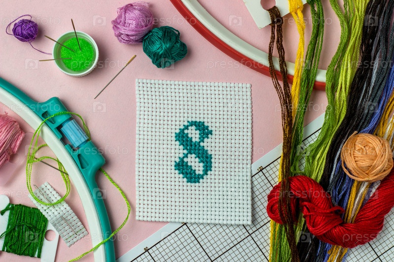 Зеленая вышивка крестиком №8 в окружении аксессуаров для вышивки: нитки разных цветов, иголки, схема, пяльцы. Ручной работы