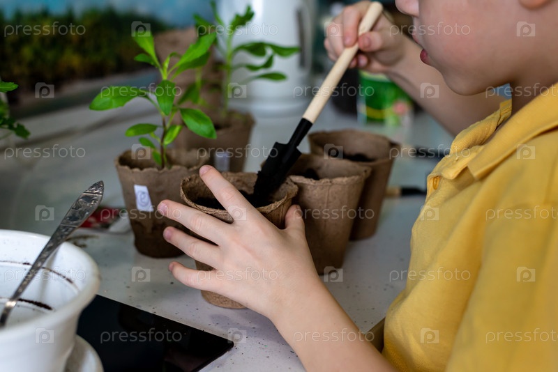 Руки мальчика-садовника занимаются пересадкой саженцев с цветом дома. Сезонное выращивание цветов