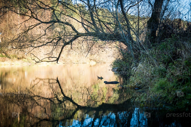 Отражение в воде, дерево над водой, ветви