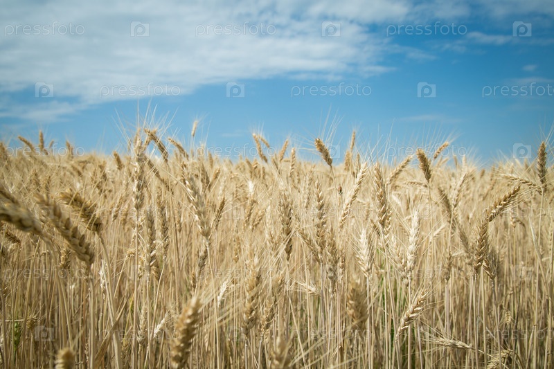 Золотая пшеница на поле на фоне голубого неба, урожай готов к сбору Золотая пшеница в поле против синего неба, урожай готов к уборке