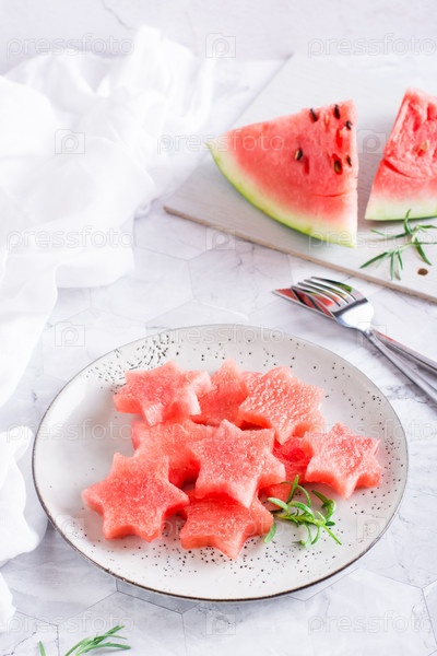 Спелые арбузные звезды на тарелке на столе. Летний отдых. Вертикальный вид