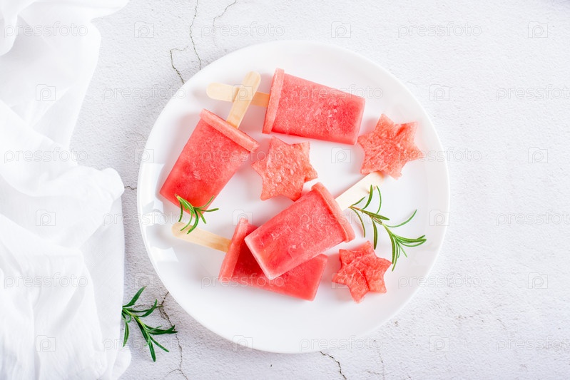 Арбузное эскимо и кусочки арбуза на тарелке на столе. Домашний десерт. Вид сверху