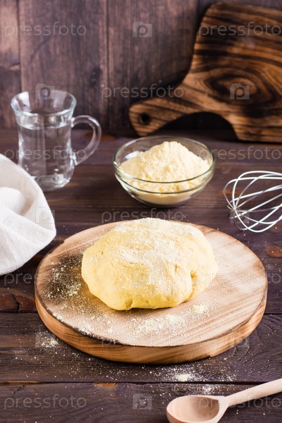 Готовое сырое тесто для выпечки мексиканских лепешек на доске. Домашняя выпечка. Вертикальный вид