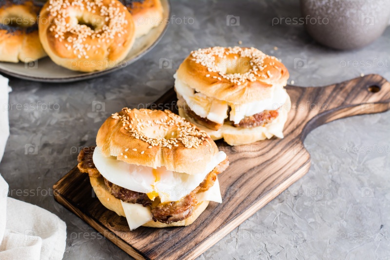 Бутерброды бублики с сыром, жареным мясом и яйцом-пашот на доске. Домашний фаст-фуд