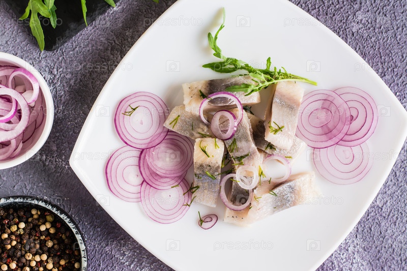 Нарезанная соленая сельдь с луком и рукколой на тарелке. Простой перекус. Вид сверху. Крупный план