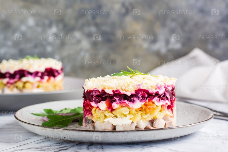 Селедка под шубой традиционный салат на тарелке на столе