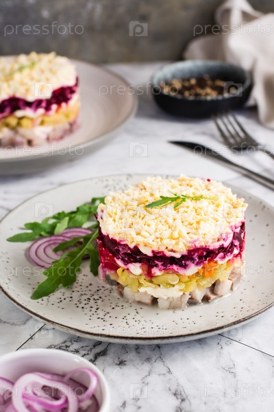 Селедка под шубой традиционный новогодний салат из овощей и рыбы. Вертикальный вид