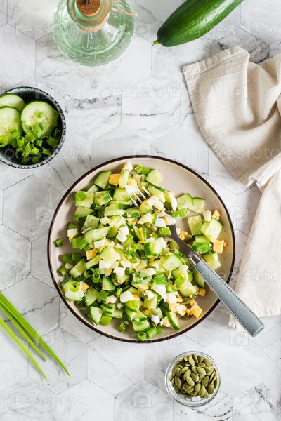 Салат из огурцов, вареного яйца и зеленого лука на тарелке. Кетогенная диета. Верхний и вертикальный вид