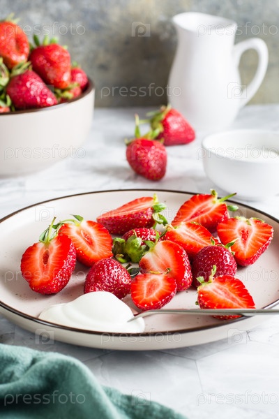 Свежая нарезанная клубника и йогурт на тарелке. Полезный витаминный десерт. Вертикальный вид. Крупный план