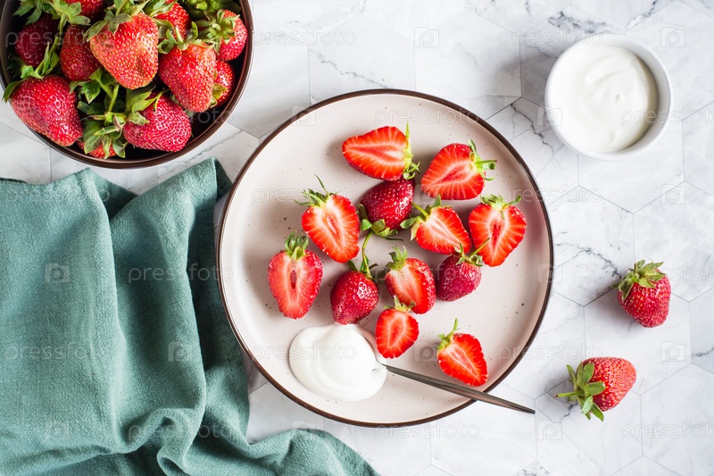 Свежая нарезанная клубника и йогурт на тарелке на столе. Полезный витаминный десерт. Вид сверху