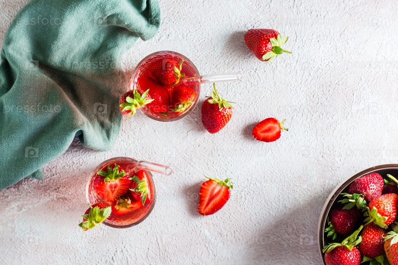 Освежающий коктейль с клубникой в стаканах с соломинкой на столе. Вид сверху