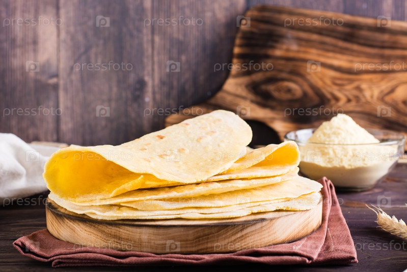 Стопка запеченных мексиканских лепешек на доске на столе. Домашняя выпечка