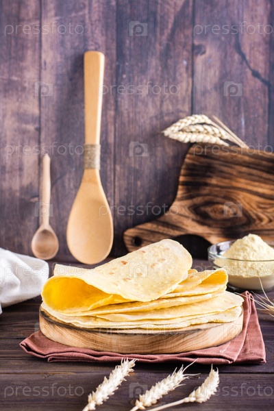 Стопка запеченных мексиканских лепешек на доске на столе. Домашняя выпечка. Вертикальный вид
