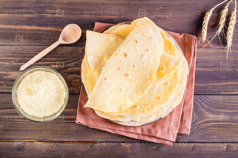 Стопка запеченных мексиканских лепешек на доске на столе. Домашняя выпечка. Вид сверху