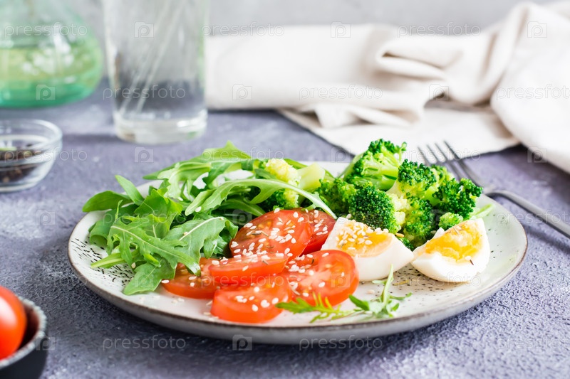 Тарелка с брокколи, помидорами, рукколой, вареным яйцом и семенами кунжута на тарелке на столе