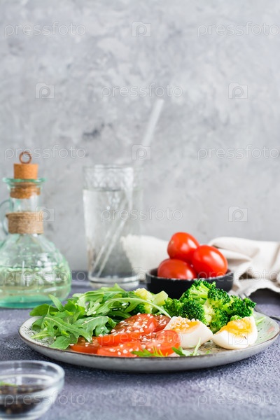 Тарелка с брокколи, помидорами, рукколой, вареным яйцом и семенами кунжута на тарелке. Вертикальный вид