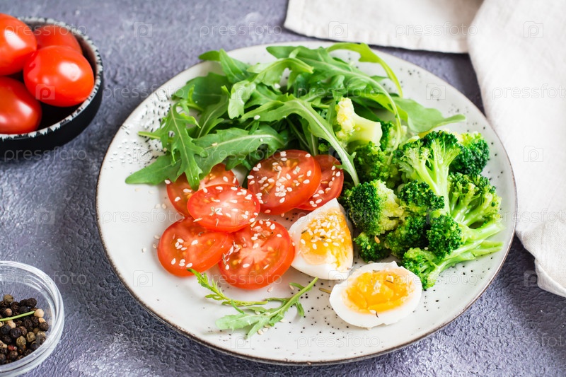 Тарелка с брокколи, рукколой, помидорами и вареным яйцом на тарелке на столе. Крупный план