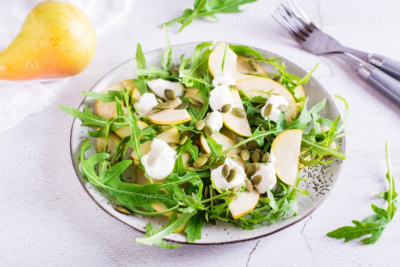 Свежий салат с грушами, рукколой, рикоттой и семенами тыквы на тарелке на столе. Домашний обед