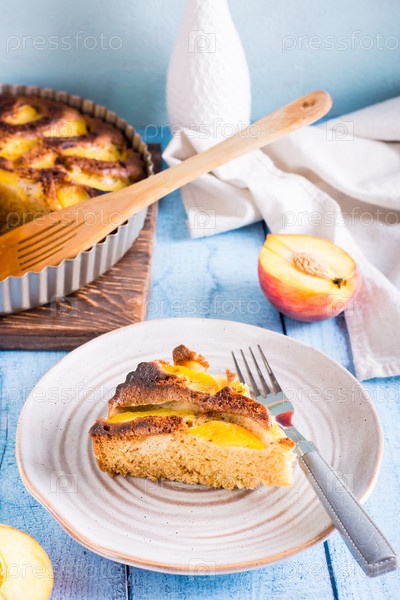 Свежий кусок персикового пирога и вилка на тарелке на столе. Домашняя выпечка. Вертикальный вид