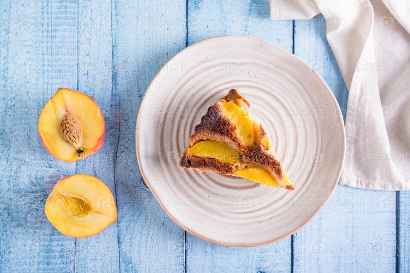 Кусок персикового пирога на тарелке и фрукты на столе. Домашняя выпечка. Вид сверху