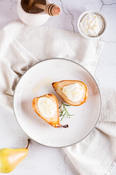 Запеченные груши с рикоттой, орехами, медом и розмарином на тарелке. Домашний десерт. Сверху и по вертикали