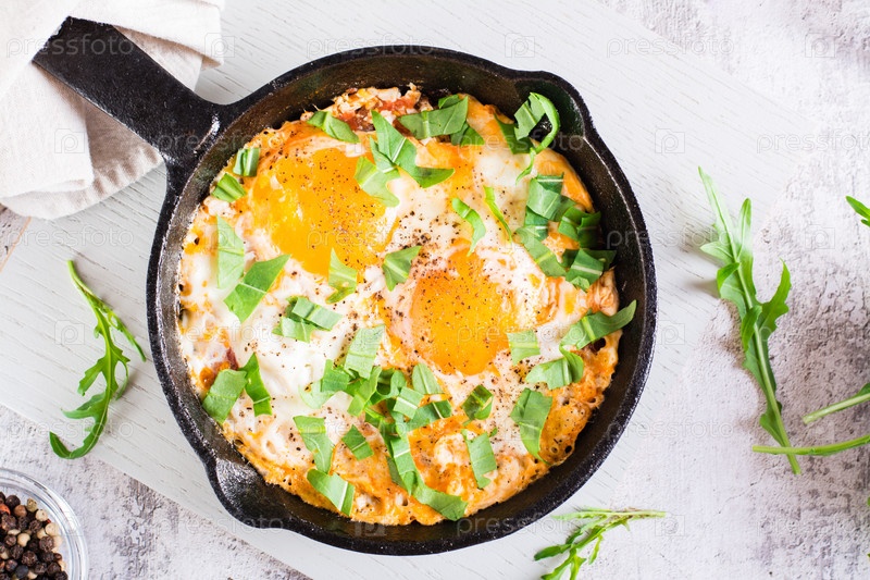 Шакшука с помидорами и рукколой на сковороде. Традиционное средиземноморское блюдо. Вид сверху. Крупный план