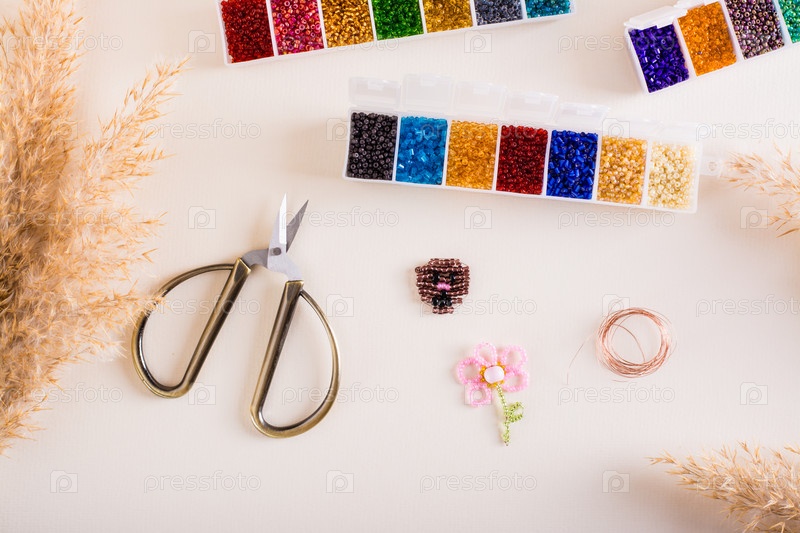 Контейнеры с цветными бусинами, проволокой и ножницами для изготовления игрушек из бисера. Рукоделие и ручная работа