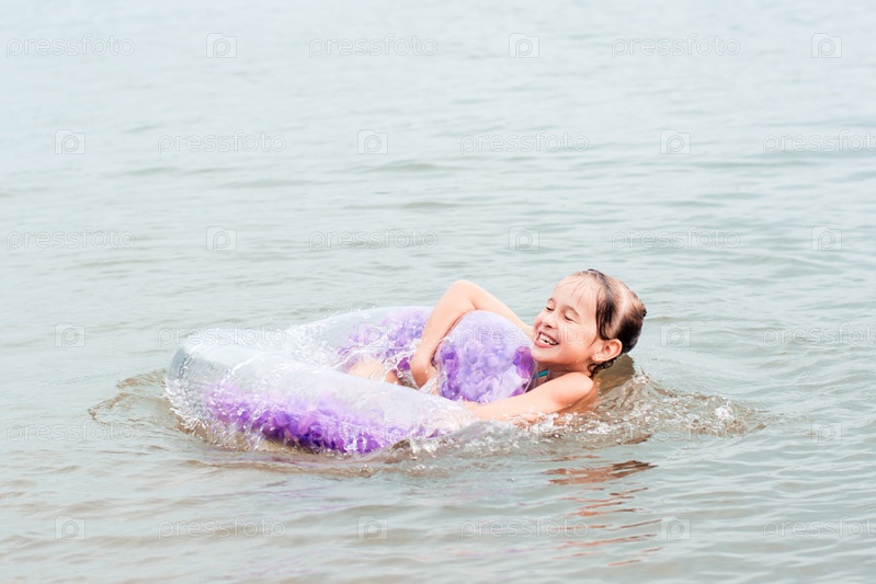 Веселая девушка держится за надувное кольцо в реке. Местный туризм. Летний отпуск