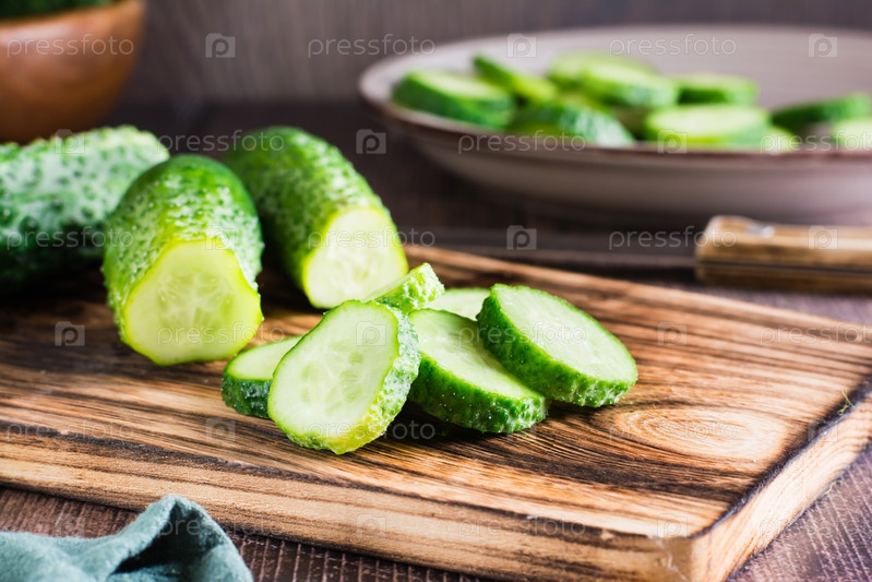 Свежие нарезанные огурцы на разделочной доске на столе. Органическое диетическое питание