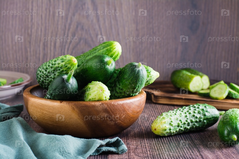 Свежие целые огурцы в миске и на деревянном столе. Диетическое органическое питание