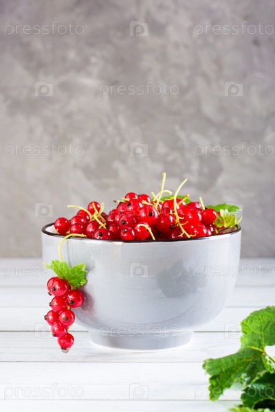 Свежая красная смородина в миске и листья на столе. Органическая летняя еда. Вертикальный вид