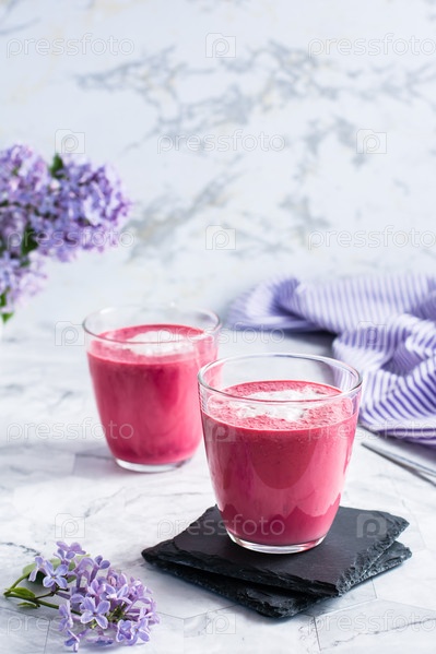 Вкусный свекольный латте в стаканах на столе. Здоровые домашние витаминные напитки. Вертикальный вид