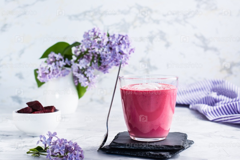 Сладкий свекольный латте в стакане и свекла в миске на столе. Здоровые домашние витаминные напитки