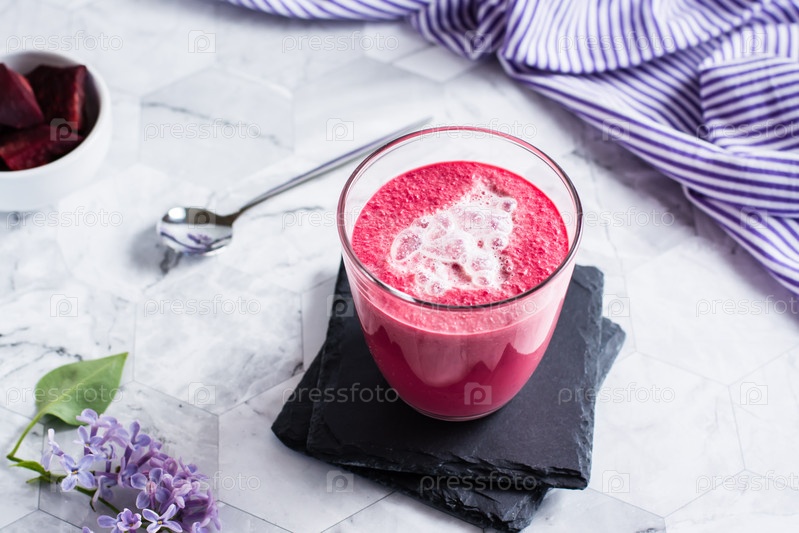 Латте из сладкой свеклы с молочной пеной в стакане на столе. Здоровые домашние витаминные напитки