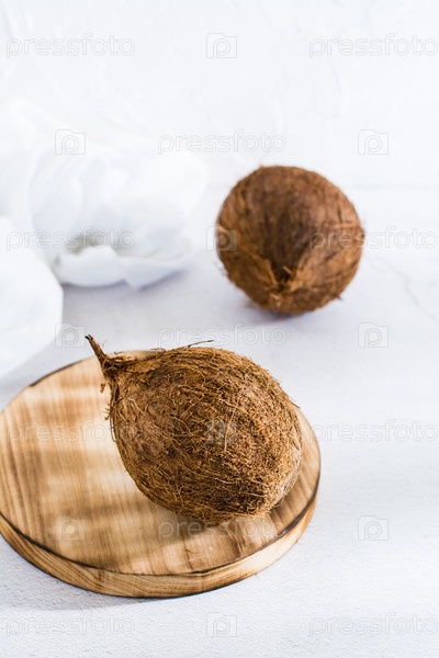 Два целых спелых кокоса на столе. Тропические фрукты. Вертикальный вид