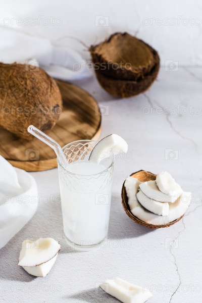 Кокосовое молоко в стакане с соломинкой и кусочками тропических фруктов на столе. Вертикальный вид