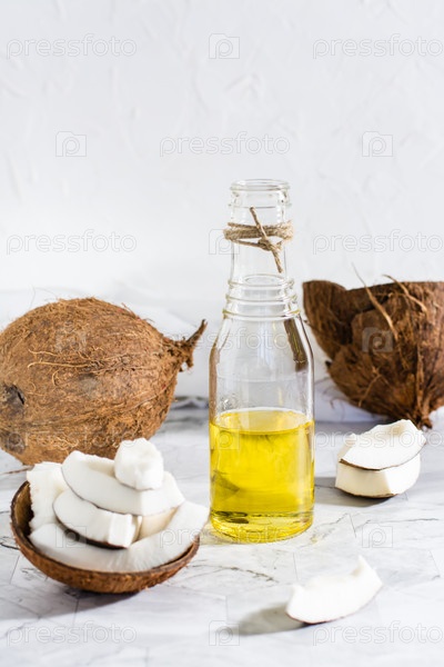 Свежее растительное кокосовое масло в бутылке и кусочки кокоса на столе. Вертикальный вид