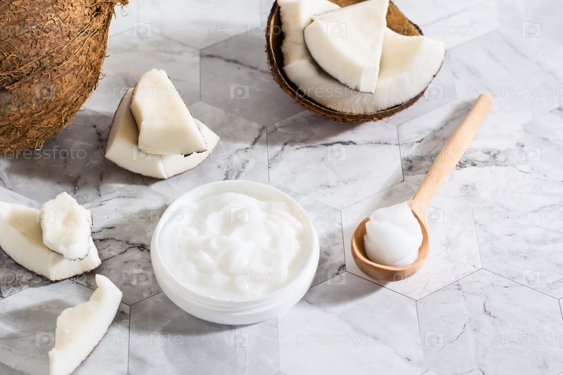 Свежее кокосовое масло в банке, деревянная ложка и кокос на столе. Натуральная косметика