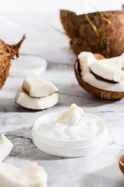 Кусочек кокоса в кокосовом масле в банке и кокос. Натуральная косметика. Вертикальный вид