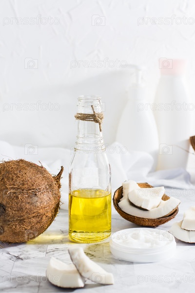 Два вида кокосового масла в банке и бутылка и кусочки кокоса на столе. Вертикальный вид