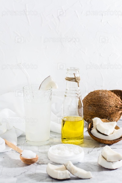 Кокосовые продукты - два вида масла и молока и кусочки кокоса на столе. Вертикальный вид
