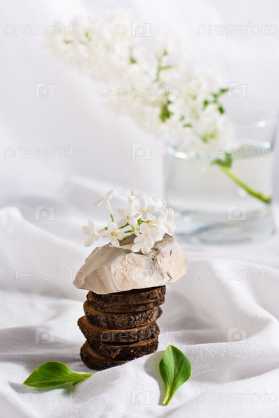 Ветки белой сирени на камне и срезы дерева и в стакане на фоне белой ткани