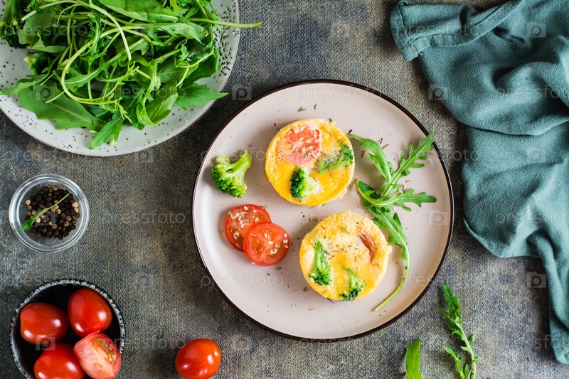 Готовые к употреблению яйца, брокколи и томатная фриттата на тарелке на столе. Домашний завтрак. Вид сверху