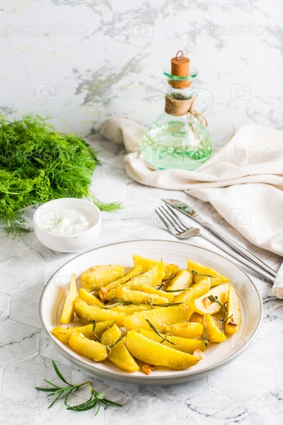 Запеченный картофель с чесноком и розмарином на тарелке и миска с соусом на столе. Вертикальный вид